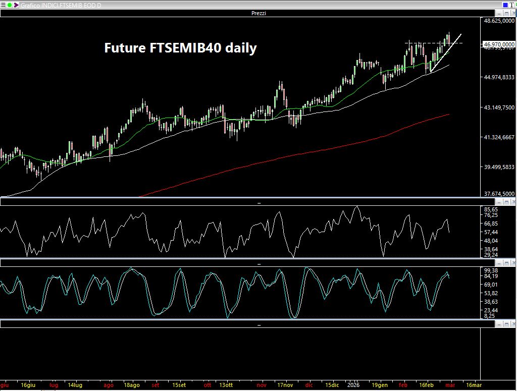 Il Future FTSEMIB40 daily ha ritoccato i massimi precedenti ma vista l'indecisione generalizzata e il fatto che venerdì la candela si sia "rimangiata" le sedute di mercoledì e giovedì mi aspetto un pò di ribasso specialmente con chiusure sotto i 47000.