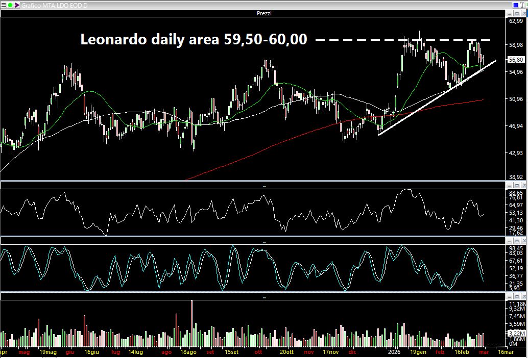 Attenzione anche e naturalmente ai titoli della difesa e quindi ad esempio a Leonardo: area da bucare attorno a 59,50-60 euro. Quando scrivo "area da bucare" non significa che comprerò in quel punto preciso. Semplicemente valuterò il comportamento del titolo nel corso della giornata. Questo significa capire se terrà o meno i vari livelli che formerà durante la fase di negoziazione in continua formando ad esempio congestioni su timeframe a 30 minuti o più brevi in grado di darmi una sorta di stop.