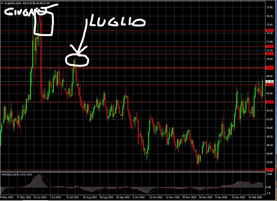 Alla luce dei recenti sviluppi in tema di attacco missilistico preventivo da parte di Israele verso l'Iran, il focus sarà puntato nuovamente sui titoli della difesa e legati al petrolio che potrebbe tranquillamente salire verso i 70,50 $ (massimo di fine luglio 2025) come da grafico giornaliero che trovate di seguito. Il close settimanale è stato a 67,29 usd. Personalmente non opero sul petrolio ma lo si può utilizzare come benchmark per capire eventuali evoluzioni del quadro geopolitico. Intendo dire che lo scorso anno ad esempio gli Stati Uniti hanno condotto attacchi missilistici contro l'Iran nel mese di Giugno e guarda caso sempre nel weekend (a memoria il 22 e 23 giugno). In quell'occasione l'oil aprì con un clamoroso gap up ma poi crollò da 76$ a 65$ in un paio di sedute (con buona pace per tutti coloro che maneggiano ETC a leva che prevedono l'azzeramento o quasi del capitale quando il sottostante subisce oscillazioni oltre un certo livello ANCHE se quell'ETC si è mosso nella "giusta" direzione prevista dall'investitore).