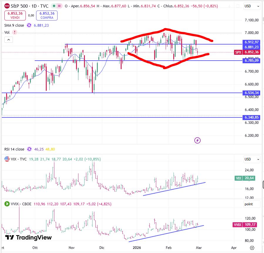 Partiamo dunque col vedere come si sta comportando l'S&P500: massimi storici a 7000, base a 6800 punti o poco sotto. A dire il vero sembra stia formando una sorta di diamante, figura piuttosto rara che precede delle inversioni di trend. Come sapete però non amo particolarmente l'analisi tecnica e preferisco di gran lunga ragionare su livelli di prezzo e talvolta di volume. L'analisi della volatilità espressa dal VIX presenta minimi crescenti come del resto ho già avuto modo di scrivere negli ultimi articoli. Questo lo si vede anche dal VVIX (la volatilità della volatilità) che tuttavia rimane leggermente più basso rispetto ai recenti massimi toccati toccati dal VIX.