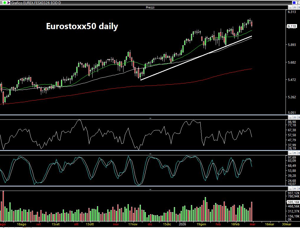 Diverso l'andamento dell'Europa che rimane su livelli più alti rispetto agli Stati Uniti. L'Eurostoxx50 daily ad esempio al momento rimane ben inserito in un trend rialzista anche se non escludo un pò di storno, magari verso la trendline dinamica ascendente che attualmente passa in area 6000 punti.
