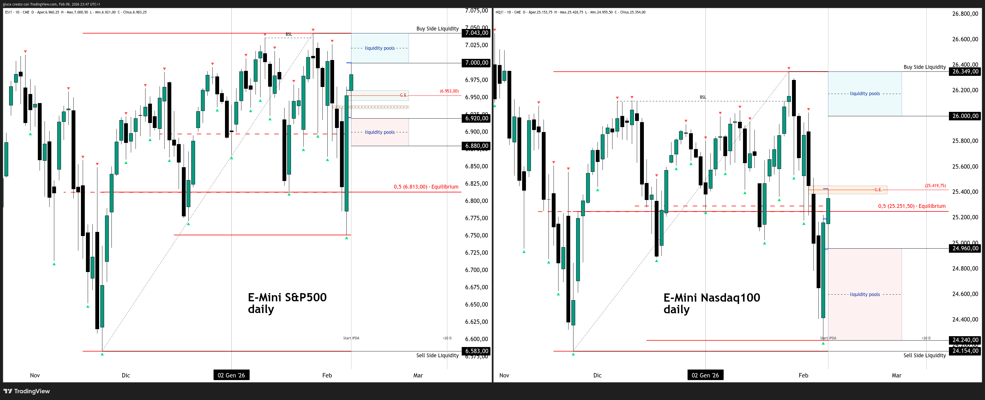 Il lunedì 9 febbraio ha visto i futures americani confermare la forza del rimbalzo iniziato venerdì 6. L'E-Mini S&P500 ha chiuso a 6983.25 (+0.44% da venerdì), toccando un massimo intraday a 7000.50. Il Nasdaq ha fatto anche meglio, chiudendo a 25354 (+0.76%), con un top a 25428.75.