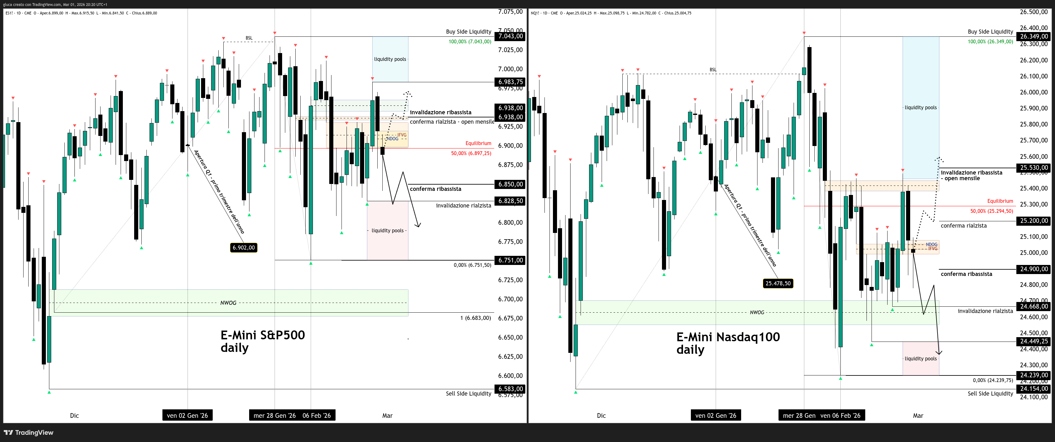 Entrambi i futures chiudono sotto l'open mensile di febbraio (S&P 6938, Nasdaq 25530) e, dato ancora più significativo, sotto l'open trimestrale Q1 (S&P 6902, Nasdaq 25478). In ottica time-based ICT questo è un segnale chiaro: il bias mensile e trimestrale sono bearish fino a prova contraria.