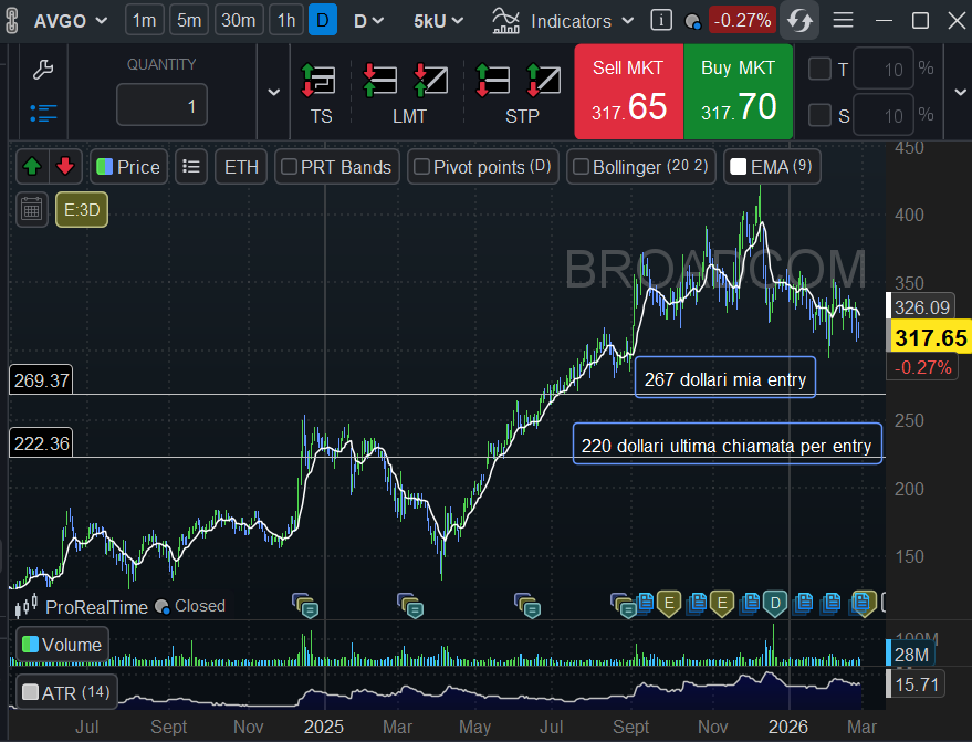 Broadcom (AVGO): la casa dei chip è in bilico. Il titolo ha sofferto per i timori di una bolla sull'AI, ma i fondamentali restano solidi e gli ordini arretrati sono enormi . Un approccio graduale: primi ingressi in area 267 dollari, con l'idea di accumulare sotto i 220 se la tempesta dovesse davvero abbattersi sul settore. Stop loss su ogni livello, ovviamente.STOP LOSS a rottura al ribasso del o dei livelli.