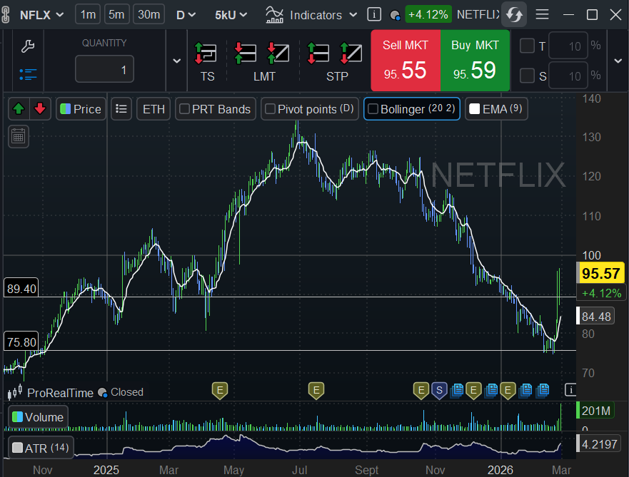 Netflix (NFLX): il mercato è frettoloso. Dopo le ottime performance, molti analisti iniziano a fare scommesse. Noi restiamo coi piedi per terra. Un eventuale ritorno in area 75 dollari potrebbe essere una zona di riaccumulazione interessante, ma solo per trader con alta propensione al rischio . Stop loss obbligatorio, perché il titolo è più volatile di quanto sembri.STOP LOSS a rottura al ribasso del o dei livelli.