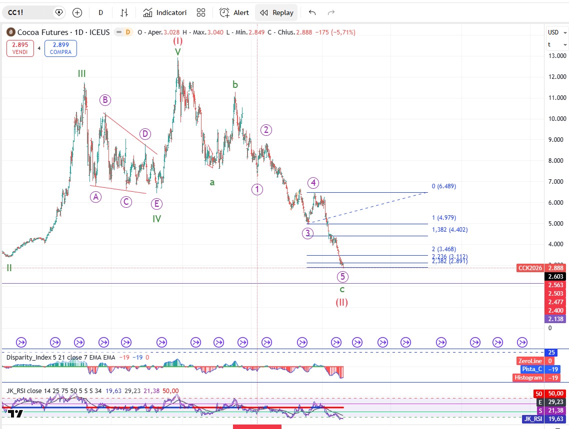 Nuova ottava ribassista per il cacao che si avvicina all’origine dell’onda(1). Se quota 2192 dovesse essere infranta il nostro modello sarebbe invalidato. Per ora continuiamo a seguire.