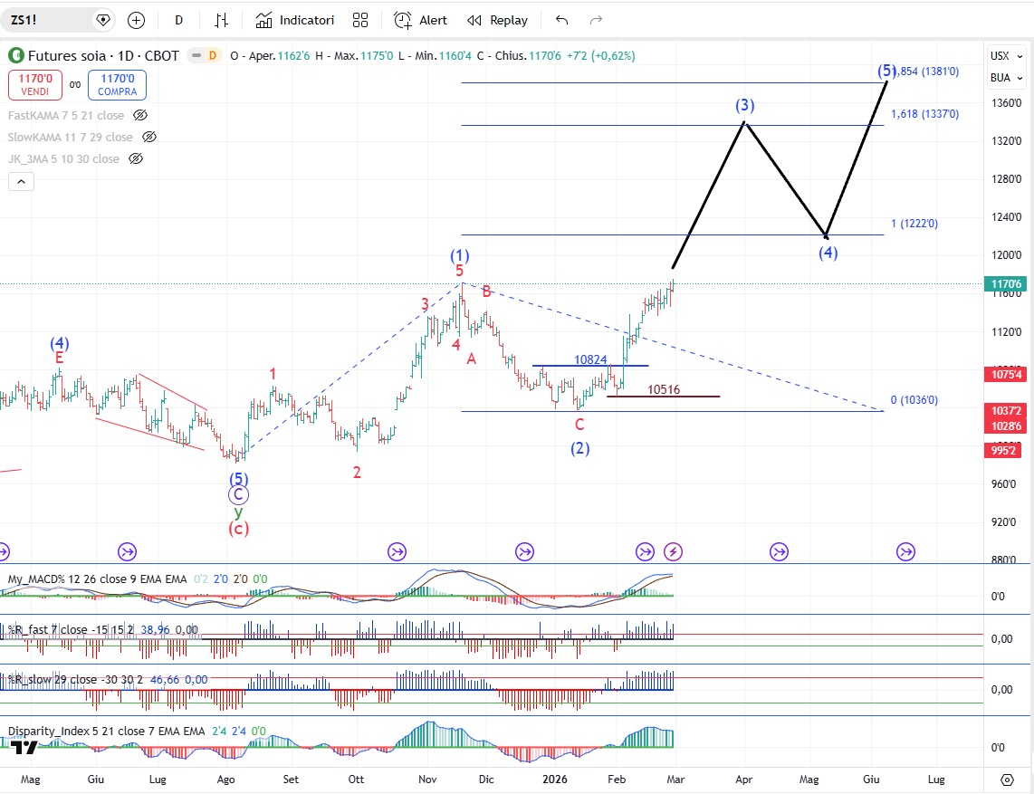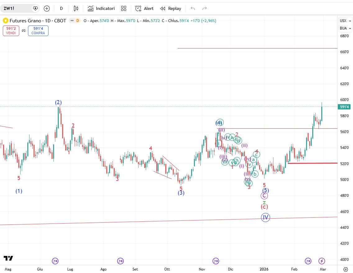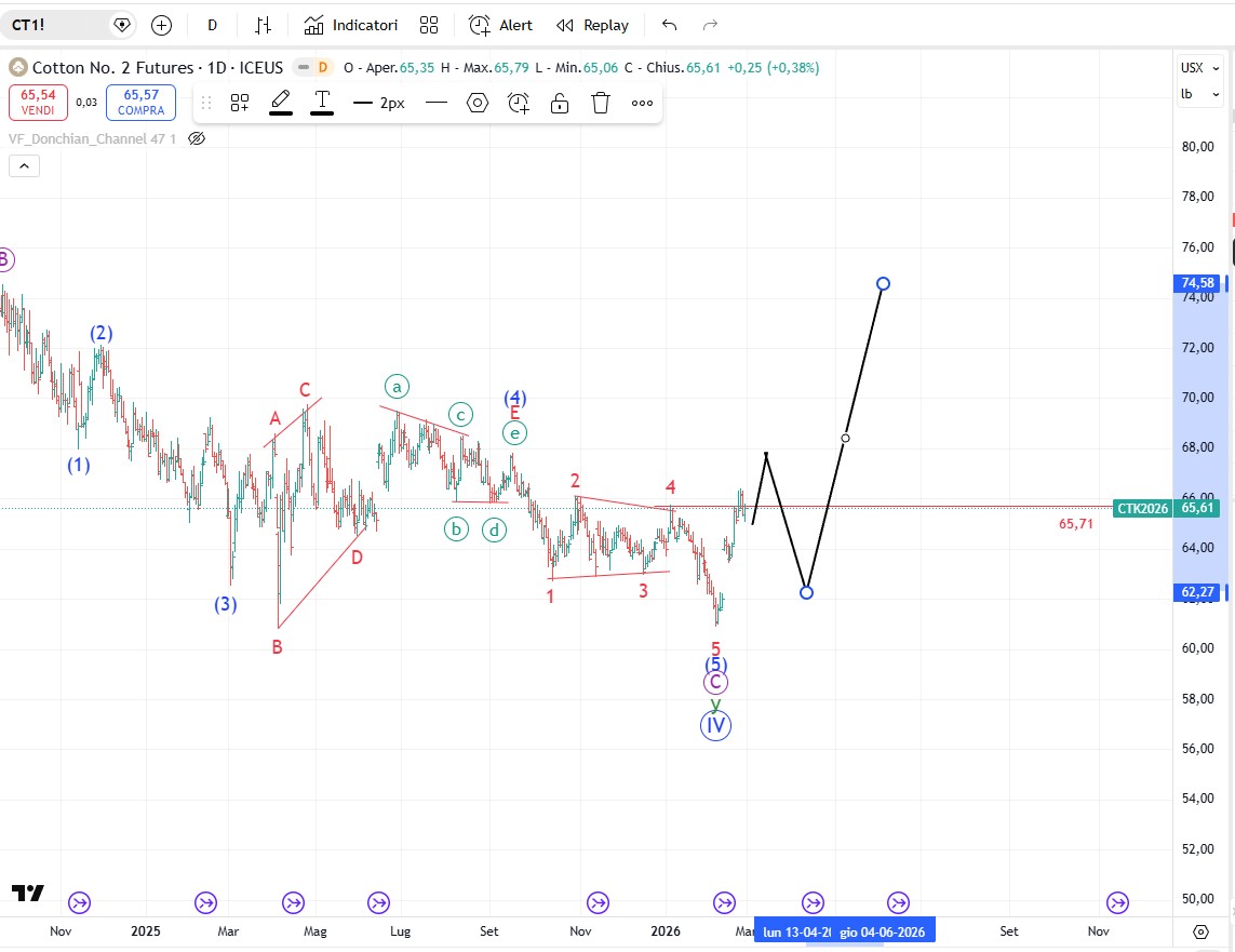 Il cotone procede bene e si avvicina a concludere un’onda 1 al rialzo. Seguirà la correzione in contro trend di onda 2 finita la quale proveremo ad entrare al rialzo.