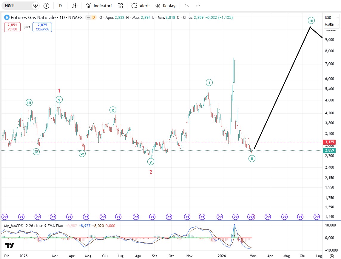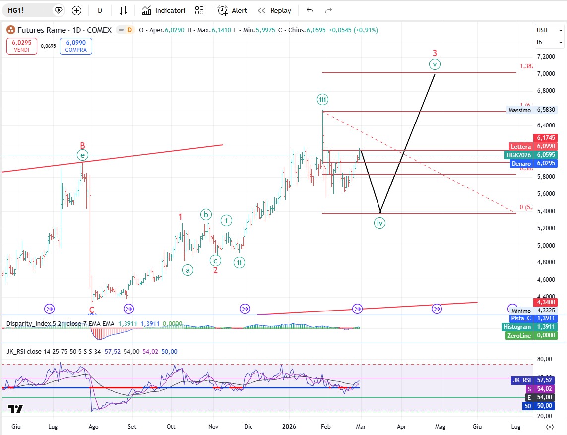 Sul rame se il nostro conteggio è corretto dovremmo essere alla fine di una (b) di [iv]. Di conseguenza il rame dovrebbe fare un’ultima onda al ribasso per poi dare il la all’onda [v] rialzista. Da Seguire.