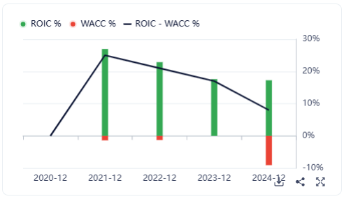 Per prima cosa notiamo che ROIC - WACC è stabilmente al di sopra del 10% e quindi al di là dei dati tecnici di bilancio che sono lunghi e noiosi l'azienda guadagna soldi a doppia cifra: lo storico fino al 31/12/2024 è il seguente: