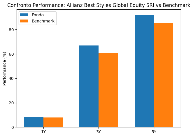 Il benchmark di riferimento è l’MSCI World Extended SRI 5% Issuer Capped Index, una versione ESG dell’indice MSCI World che applica criteri di sostenibilità e limiti di concentrazione sugli emittenti.