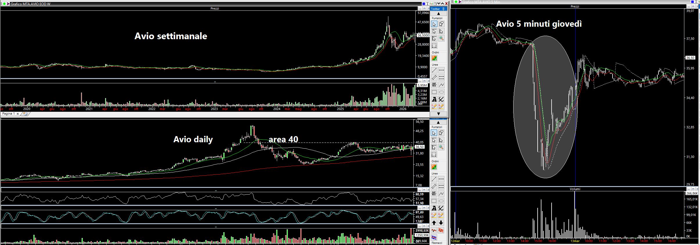 Venerdì 20 marzo ci sarà la revisione del paniere sul FTSEMIB40. Le azioni di Avio entreranno al posto di quelle di Banca Popolare di Sondrio (cambio operativo dal 23 marzo). La revisione è sempre un momento importante perché ETF e fondi passivi dovranno comprare. Detto questo, Avio è stata protagonista di una seduta folle nella giornata di giovedì in occasione della pubblicazione dei dati che hanno visto ricavi a 542 milioni di euro (+23% sul 2024), EBITDA a 32,3 milioni (+25% anno su anno), EBIT a +43% sul 2024 ed un utile netto si 11,6 milioni. Premesso che per me la società è cara rispetto ai risultati pubblicati (capitalizza 1,7 miliardi) ed anche se è vero che ci sono poche società al mondo che fanno razzi, giovedì il titolo è passato da 37 euro a 30,60 (circa -17% in pochi minuti) salvo poi tornare praticamente al punto di partenza nella giornata di venerdì (close weekly a 36.50 euro). Nell'ottica della scommessa (size da schedina del superenalotto) e della revisione del paniere, con uno stop attorno a 33 euro mi aspetto che si possano rivedere i 39-40 euro, poi si vedrà.