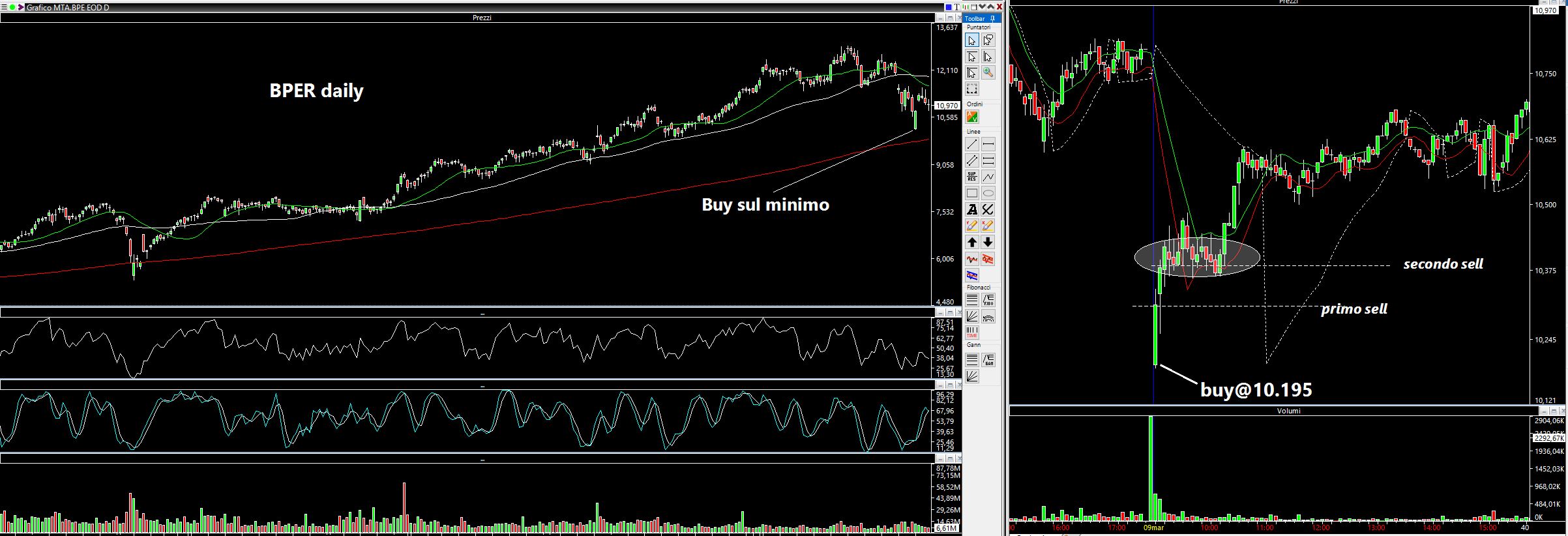 Partiamo subito con la prima: BPER Banca nella giornata di lunedì. Premessa: come da articolo di sabato scorso la volatilità non poteva che essere massima o molto elevata visto il weekend. Molti titoli bancari stavano aprendo in forte ribasso. Personalmente ho guardato il driver Unicredit che presentava una perdita del 4% rispetto a venerdì. Bper Banca invece presentava una apertura a -5,15% con un software che cercava di far risalire il titolo e quindi ho deciso di longare 2mila pezzi con l'idea che si potesse coprire in qualche modo il gap con altri bancari. Buy@10.195 eseguito ed uscita di metà posizione a 10.31 "giocandomi" il resto che ho poi liquidato a 10.38 euro. Peccato perché col senno di poi non sarei mai andato il loss e il giorno dopo il titolo valeva già un euro sopra! Ma come detto in precedenza il mercato toglie (o ruba ????) con facilità e quindi meglio accontentarsi, almeno per me.
