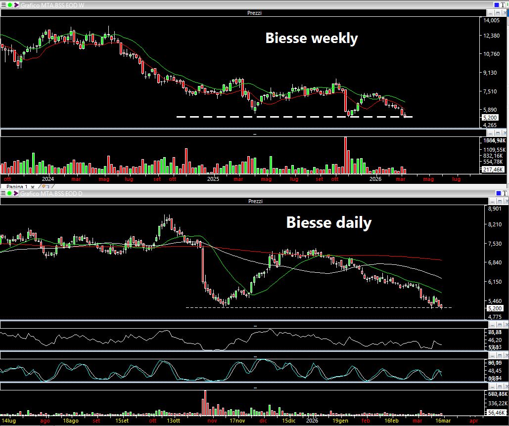 Tentativo di rottura in corso di un forte supporto ben visibile sia su scala settimanale che sul daily. Segnale invalidato sopra 5,70 rispetto ai 5,20 della chiusura di venerdì. Nei giorni scorsi c'era una macchinetta che vendeva.