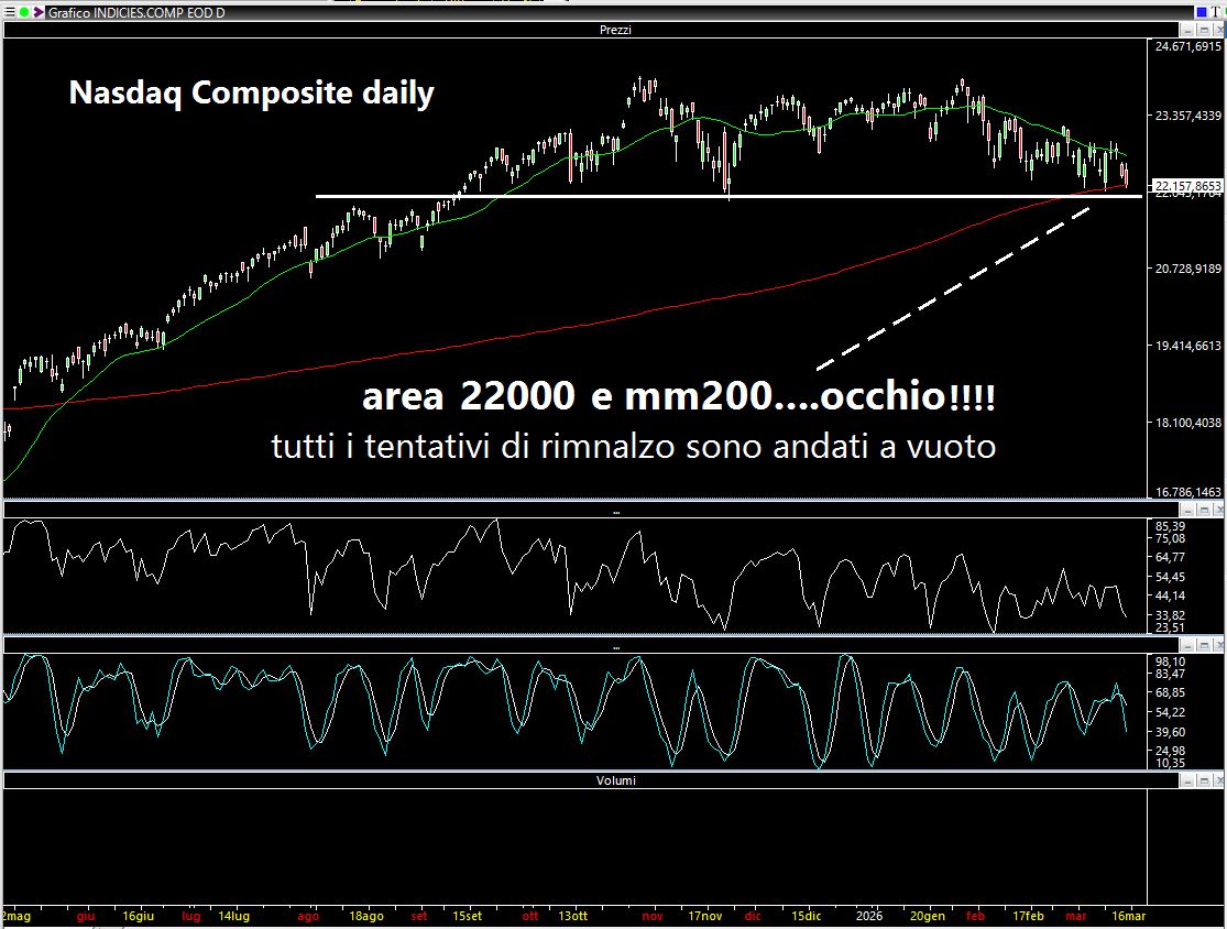 Anche l'indice Nasdaq Composite che trovate su scala daily nel grafico successivo si è avvicinato pericolosamente alla zona dei 22000 punti nei pressi della quale passa la media mobile a 200 periodi e come se non bastasse si tratta di un supporto statico di estrema importanza. Non mi piace il fatto che l'indice abbia più volte cercato il rimbalzo che però si è affievolito poche sedute dopo: la sensazione è che stiano puntellando il pavimento!
