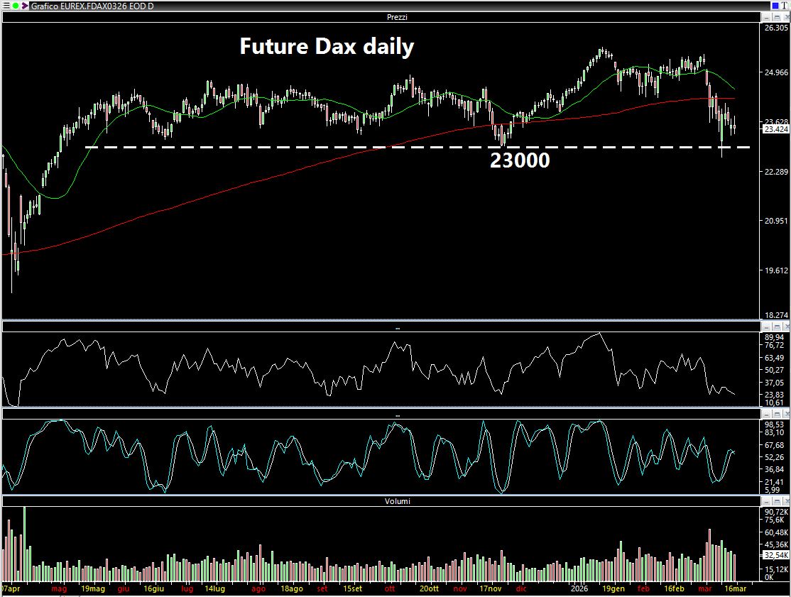 In Europa il DAX Future ha toccato (e bucato) il grande supporto indicato sabato scorso. Per fortuna si è trattato, di fatto, di una semplice sbavatura, con un minimo settimanale a 22.670 punti.