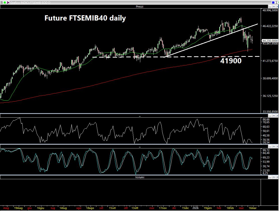 Il nostro Future FTSEMIB40 presenta un andamento assai simile a quello dell' Eurostoxx 50 infatti la debolezza del settore bancario è stata controbilanciata dalla forza di Eni o delle utilities. Se non dovesse tenere i 42700 punti (minimo settimanale) lo step successivo sarebbe verso i 41900-42000. Risk-off anche qui.