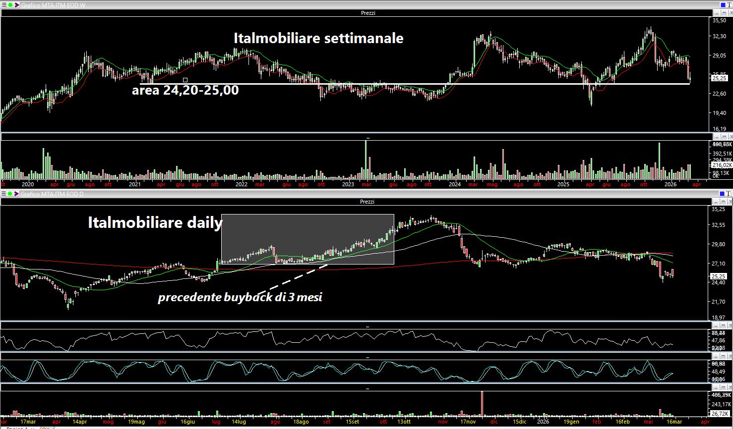 La holding della famiglia Pesenti, con ricavi 2025 attorno ai 777 miliori di euro ed un utile netto di 55,7 milioni di euro ha proposto un dividendo di 1,10 euro per azione con stacco il 4 maggio 2026. Il NAV per azione è di 54,8 euro. Capitalizza 1,07 miliardi ed ha una cassa netta di 231 milioni di euro. Lunedì 16 marzo e fino al 17 aprile 2026 inizierà un programma di riacquisto di azioni proprie fino a 300mila pezzi. Il buyback precedente da 350mila azioni era partito il 3 luglio e si era concluso il 30 settembre 2025 ed aveva portato il titolo da 23 euro a poco più di 30 nell'arco di soli tre mesi. Essendo il nuovo buyback concentrato in un solo mese, sono curioso di vedere se si riuscirà a vedere qualche risultato sul titolo. Graficamente sul settimanale l'azione ha testato una vecchia area in cui i prezzi hanno "ballato" molto spesso in passato ovvero attorno ai 24,20-25,00 euro.