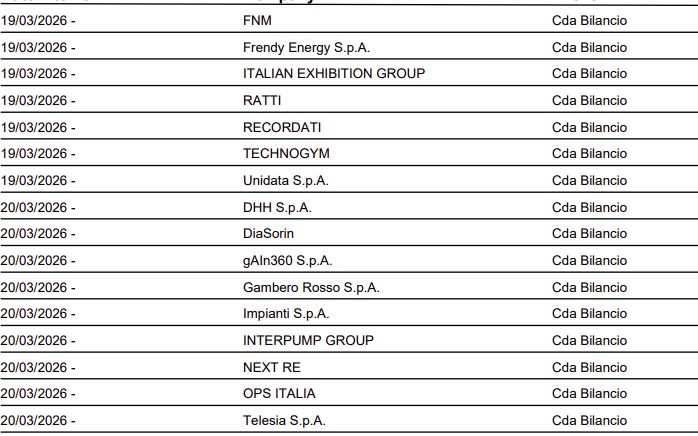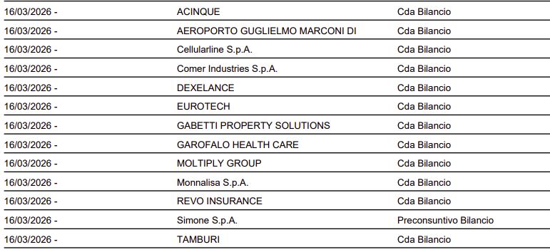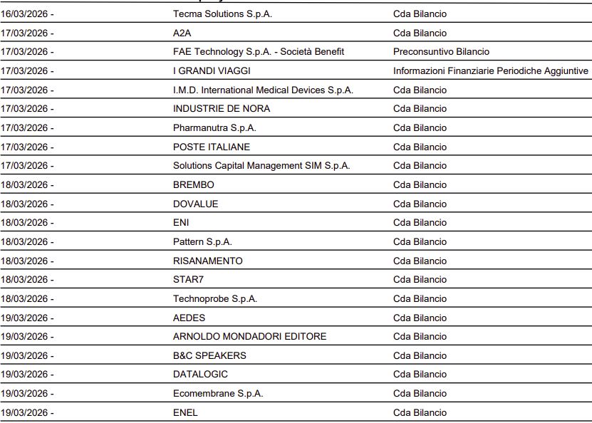 Di seguito il calendario societario per la settimana entrante (che sarà anche di scadenze tecniche importanti visto che si tratta del primo trimestre). Fonte dati: Borsa Italiana. Come sempre invito lettrici e lettori a verificarne la correttezza onde evitare errori.