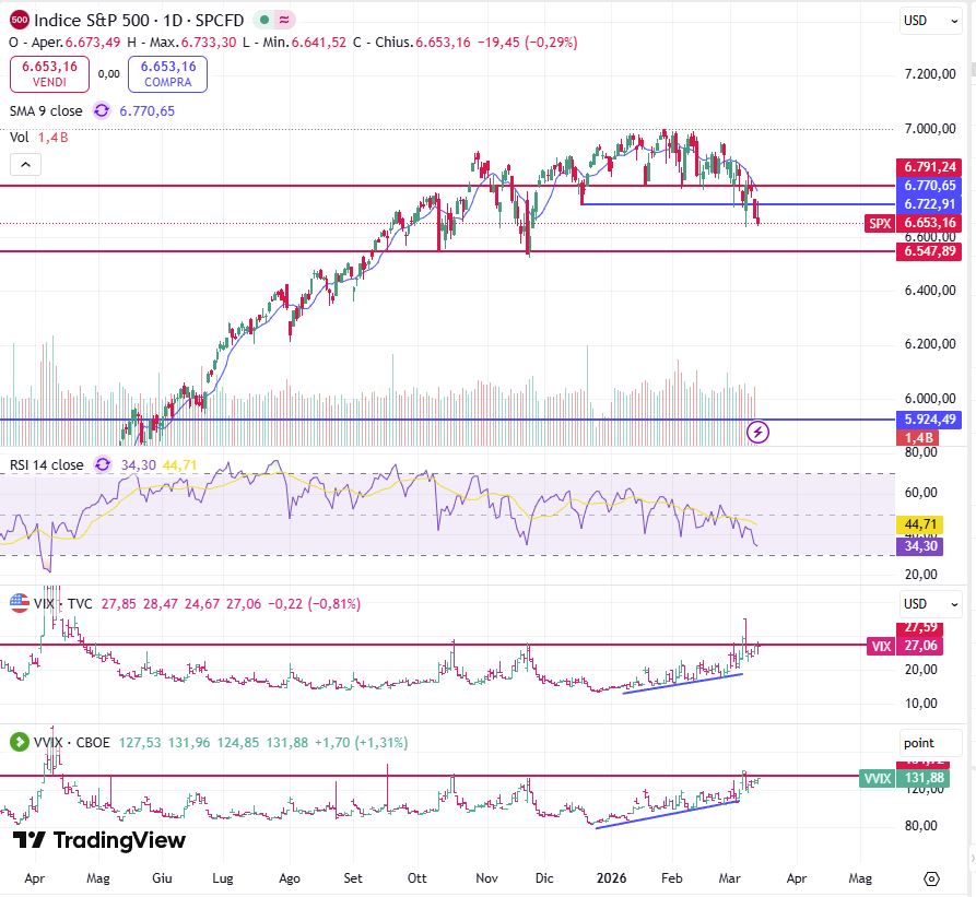 Lunedì abbiamo assistito a un’apertura in leggero gap down sull’S&P 500, con un affondo iniziale fino all’area dei 6.645 punti. Dopodiché c’è stato un recupero molto forte che ha spinto l’indice, nel finale di seduta, fino a 6.791 punti. Notate bene che le linee che vedete nel grafico successivo sono esattamente le stesse della scorsa settimana. Ebbene, i 6.791 punti hanno costituito una sorta di tappo per il rimbalzo o, se preferite, una sorta di pullback. La settimana si chiude sui minimi e questo mi fa pensare che l’indice voglia andare a testare l’area collocata attorno ai 6.550 punti. Rimane dunque massima cautela e un atteggiamento orientato al risk-off.