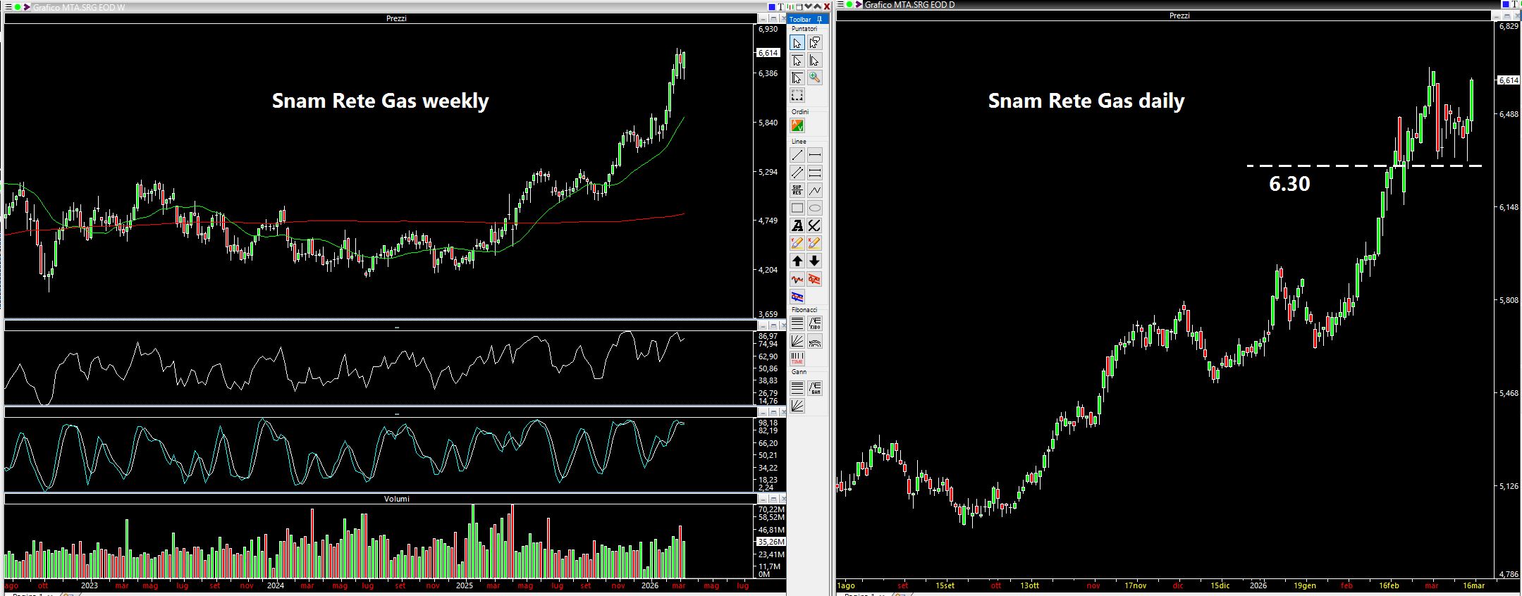 Prima parlavo di utilities: Snam, già analizzata nelle scorse settimane (vado a memoria), continua ad essere in un bel trend rialzista bucando massimi su massimi. In questi casi, facendo i debiti scongiuri, lo stop andrebbe collocato in area 6,30 come si vede dal grafico daily. Su quello settimanale siamo sui massimi storici.