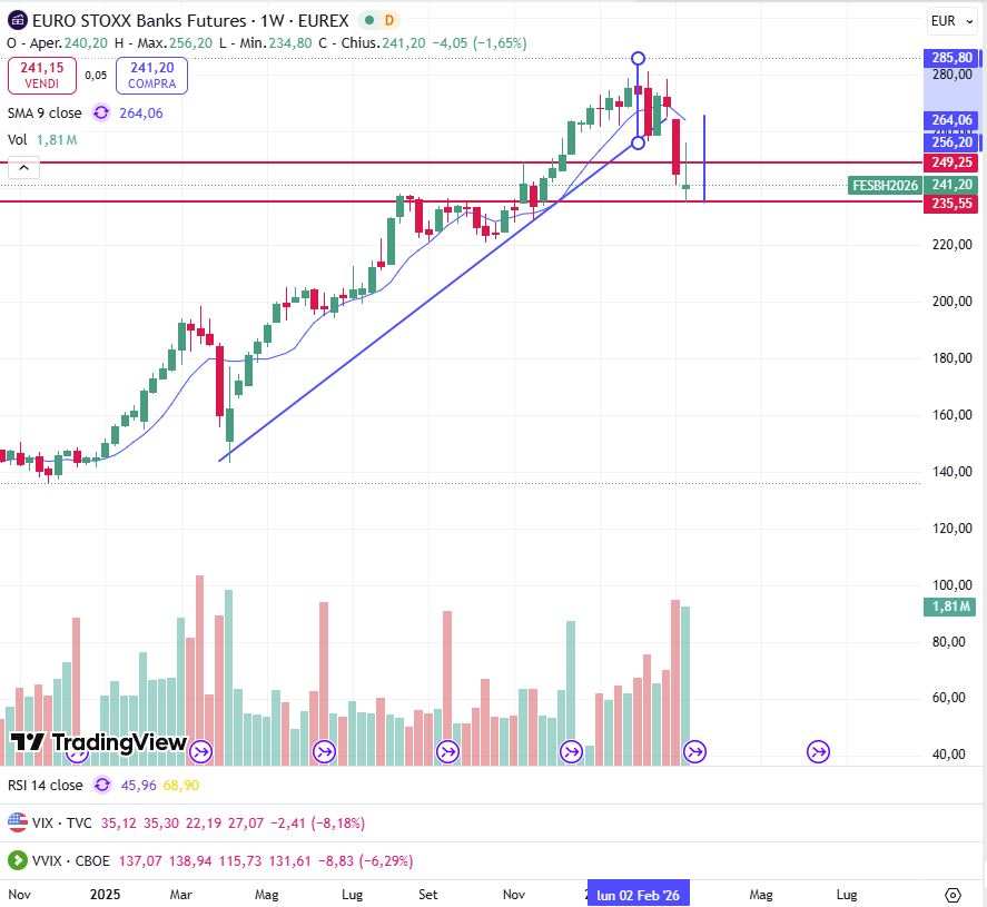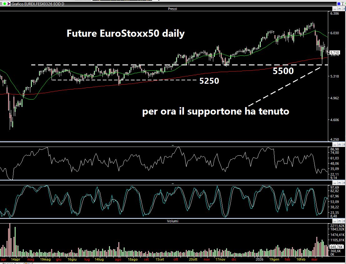Uno sguardo anche al Future Eurostoxx50 che su scala daily ha testato i 5500 punti in apertura di ottava ed ora è tornato verso la media mobile a 200 periodi. Un pò più forte rispetto al settore bancario (ovviamente), visto che le componenti sono molteplici. Sotto i 5500 punti troviamo i 5250 e forse qualcosa sotto.