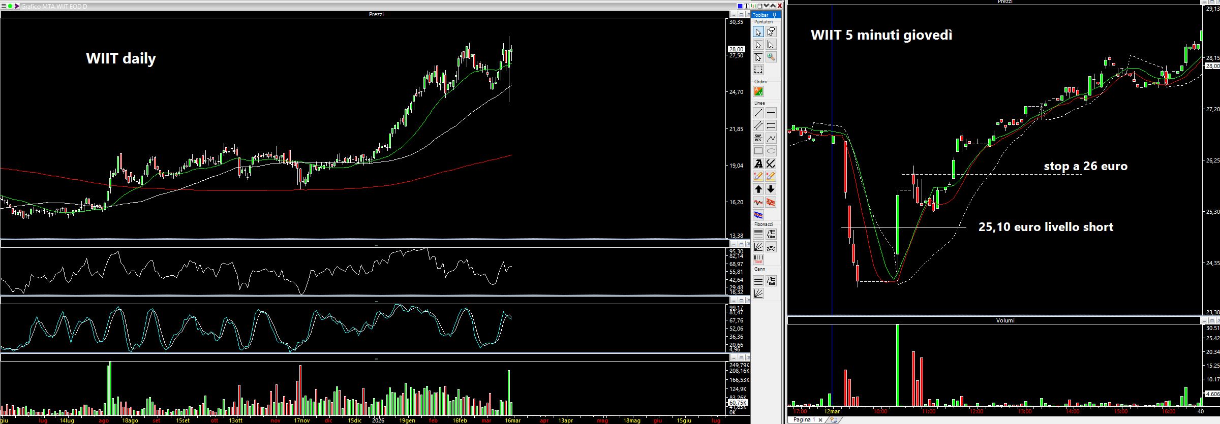 Ed ora veniamo ad una operazione in perdita. Giovedì sulle azioni WIIT. Come da calendario che pubblico settimanalmente, escono i risultati a mio avviso positivi specialmente sulla redditività, cresciuta più dei ricavi grazie ad una crescita in Italia ed in Germania. Ricavi adjusted a 167,9 milioni di euro (+5,9% sul 2024), EBITDA adjusted a 66,9 milioni (+15,2%), utile netto adjusted a 16,5 milioni di euro. Dati a mio avviso non brutti ma.....gli algoritmi che operano di concerto cosa fanno? Vendono con il solito meccanismo "a valanga" come lo chiamo io. Non vengono vietati e quindi manipolare il mercato è un gioco da ragazzi. Un primo ordine grosso innesca il counter clockwise sul book: un movimento antiorario in cui la lettera si abbassa e i quotatori precedono gli ordini e affossano tutto. Ed è così che si passa da poco più di 26,60 euro a 24 euro in pochi minuti (-10%). Mi metto short a 25,10 euro ma....magicamente l'azione, dopo essere stata sospesa per eccesso di ribasso, riapre dopo 50 minuti (anche qui Borsa Italiana probabilmente non aveva sentito la sveglia del mattino...beata lei!). Ebbene: viene fatta ribaltare la macchinetta che scavallava gli ordini in vendita con un grosso ordine in acquisto ed il titolo viene mandato in sospensione per eccesso di rialzo (in CINQUE minuti!!!!). Personalmente avevo shortato solo 100 pezzi, 2500 euro di ctv subodorando la fregatura, ma mi sono stoppato già a 26 euro ed ho fatto benissimo: a fine seduta l'azione ha chiuso sui massimi!