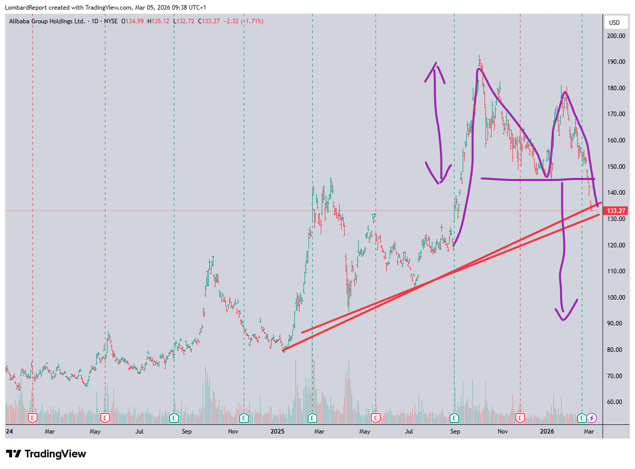 Vendiamo Alibaba mercato oggi in apertura. L’azione non ha mantenuto le promesse e si trova su un pattern grafico pericoloso con obiettivo verso 100 a causa di un doppio massimo e di una trendline che è in via di rottura. Per prudenza al fine di non aumentare la possibile perdita portiamo a casa il capitale.