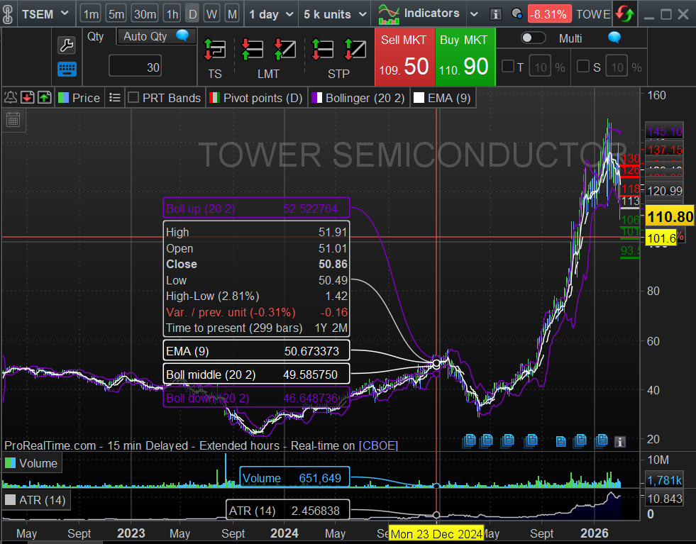 Ma a pensarci bene un titolo l'ho messo nel mirino e proverò il colpo i 101 dollari sempre con stop loss piu o meno stretto in base all'andamento e al nervosismo che gl'indici mostreranno nel giorno in cui il tocco avverrà. Sto parlando di Tower Semiconductor (TSEM)
