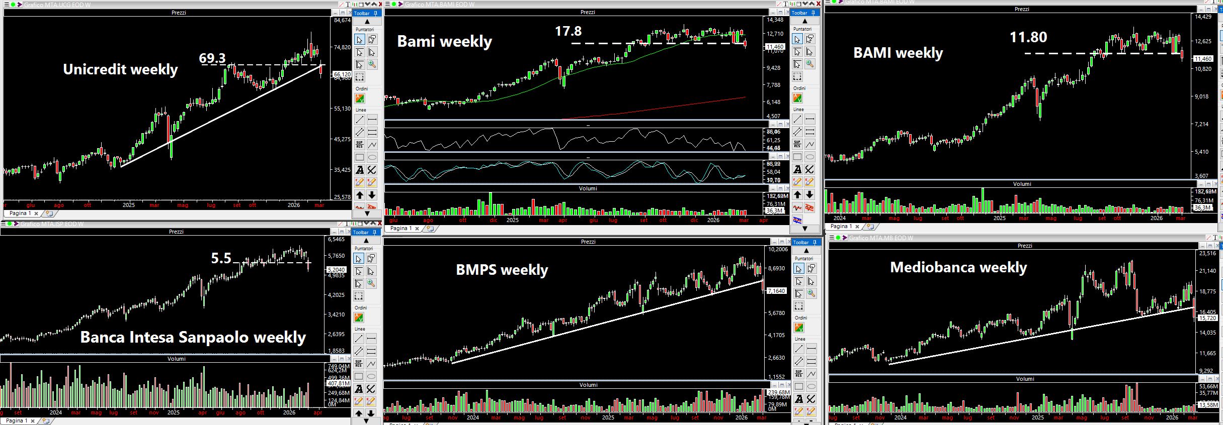 Il movimento di questa settimana è stato molto veloce e come avevo evidenziato sabato scorso la situazione si presentava potenzialmente delicata. In questa ottava ne abbiamo avuto la conferma. Dai grafici successivi, tutti su scala settimanale, si vede che apparentemente il trend weekly è ancora intatto, peccato che siano state rotte trendline o supporti statici importanti e questo per ora non depone bene. Sarà da valutare se, come successo negli anni passati, la narrativa dei media propenderà a favore del settore: si alzano i tassi a causa dell'inflazione e quindi il settore bancario ne beneficerà. La storia si ripete diceva Vico, ma mai allo stesso modo aggiungo io.