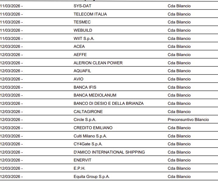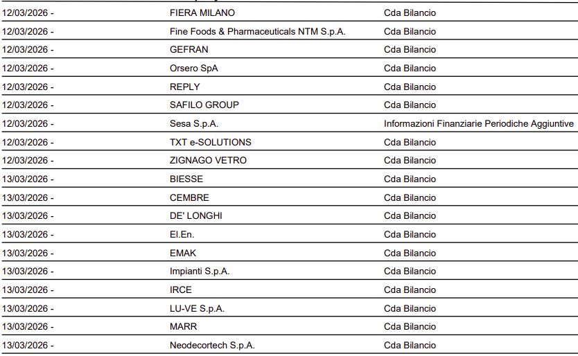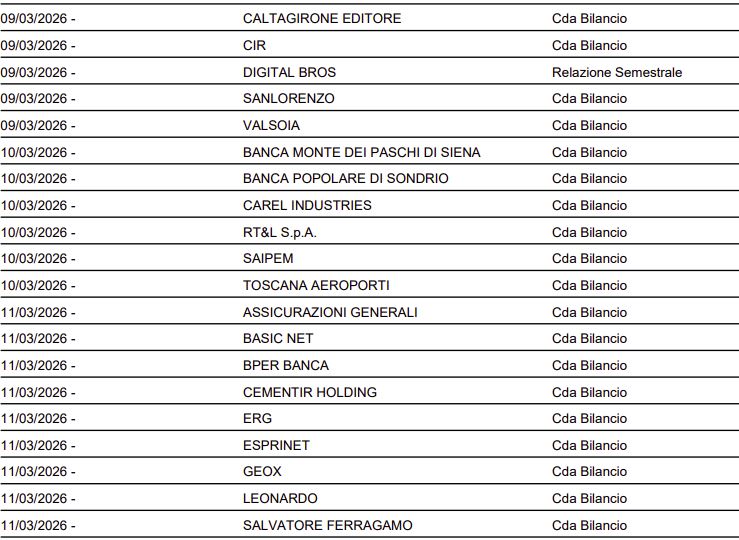Di seguito il calendario societario per la settimana entrante (Fonte dati: Borsa Italiana).
