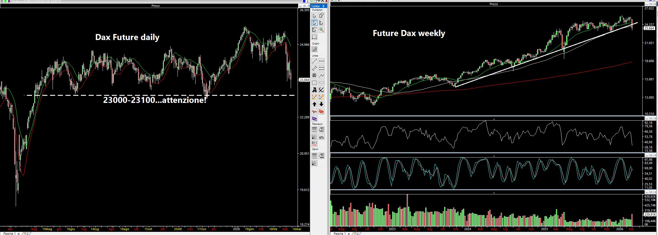 Il Dax Future si dirige verso i 23000-23100 punti quindi GRANDE attenzione. Meglio lo short su eventuali rimbalzi, magari con un Micro Dax (valore 1 euro a punto) in ottica assicurativa di portafoglio. Qualora risalisse verso i 25000 si perderebbero 1500 euro. Sul grafico settimanale, escludendo la volatilità di aprile dello scorso anno ed agosto 2024, abbiamo rotto una trendline dinamica rialzista di lunghissimo periodo.