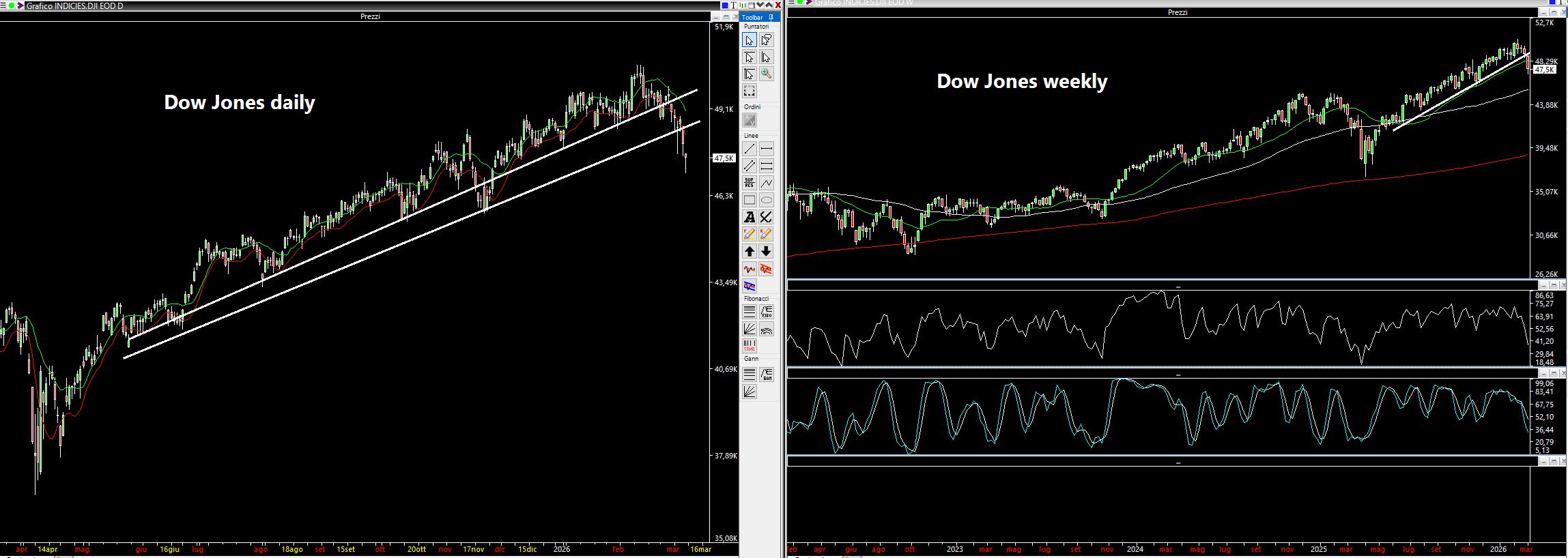 Un grafico vagamente simile lo troviamo sul Dow Jones che ha rotto la trendline dinamica ascendente.