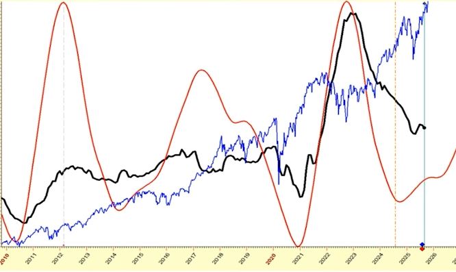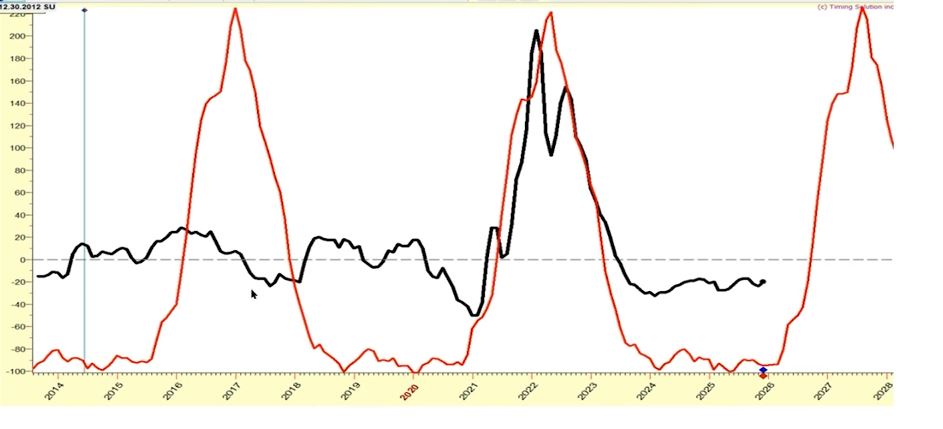 Qui il problema riguarda il possibile rialzo dell'inflazione che tende a seguire il ciclo che trovate qui sotto. L'andamento previsionale/ciclico è espresso dalla curva rossa, quello reale/attuale da quella nera.