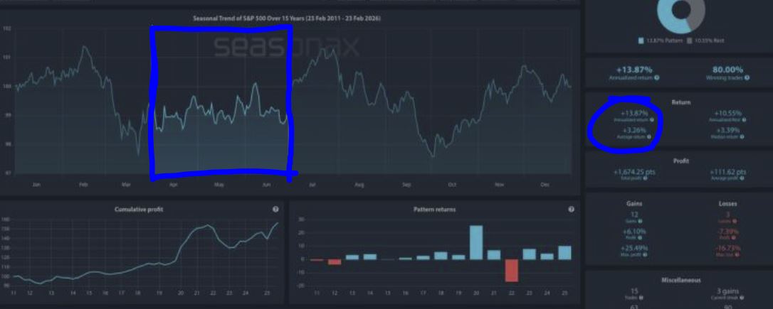 Quella che si chiude è stata certamente una settimana difficile per i mercati azionari per i motivi che tutti noi sappiamo e sui quali non mi ripeterò. Questa situazione di aumento di volatilità cade guarda caso proprio nel mese di marzo che rappresenta un mese "delicato" nel quale si sono registrati importanti ribassi (e minimi) nella storia di Borsa. Penso ad esempio al bottom del 2009 piuttosto che al 2020 (Covid). Negli ultimi 15 anni l'S&P500 ha avuto un rendimento medio annualizzato negativo ed attorno al -1.06%. Nel grafico che trovate in seguito Marzo ha sperimentato una fase di stallo della tendenza in atto, un po' come sta capitando ora. Diciamo un mese di consolidamento e non di potenziale rialzo.
