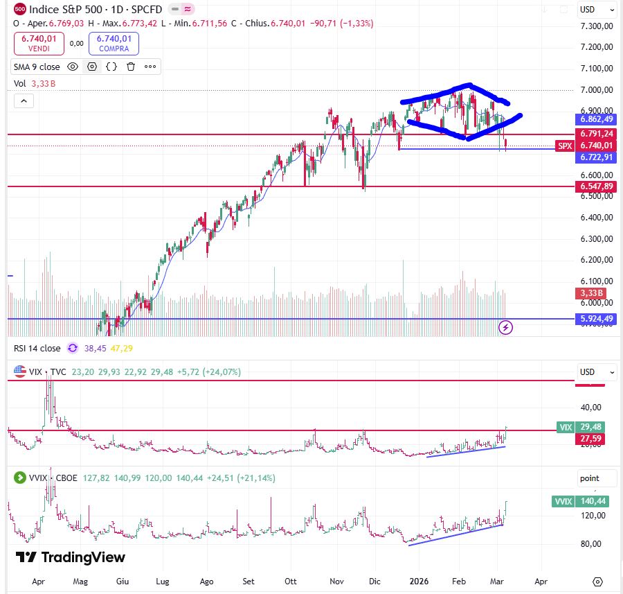 L'indice ha flirtato a lungo col supporto individuato nelle scorse settimane a 6790-6800 punti. Osservate quante code ha fatto! Per ben due volte ha testato i 6725 punti (semiretta orizzontale blu) ma ora il rischio che personalmente vedo è quello che la mancata tenuta di quest'area possa portarlo verso il "piano basso" che colloco verso i 6550 punti. Lo scenario ribassista è avvalorato anche dalla risalita del VIX e della sua volatilità espressa dal VVIX, ovvero la "paura che la paura possa aumentare". Attualmente il VIX si trova a 29,48 punti quindi su livelli che non si vedevano da diversi mesi a questa parte. Sostanzialmente li troviamo nel periodo di fine marzo-aprile dello scorso anno per intenderci.