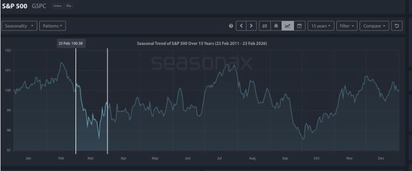 Questo fattore è dovuto ad aggiustamenti di portafoglio (fine primo trimestre), alle riunioni della FED o comunque delle Banche Centrali ma anche ad una sorta di effetto liquidità in vista del pagamento delle scadenze fiscali di metà aprile e quindi investitori ed aziende tendono a raccogliere liquidità per far fronte agli adempimenti fiscali. Questo fattore tende a ridurre in modo sostanziale la liquidità e quindi i mercati diventano già di loro più fragili. In questo caso abbiamo anche la guerra contro l'Iran e quindi un motivo di tensione in più c'è: de facto è come se avessimo un soggetto con le difese immunitarie basse e lo mettessimo nel reparto di malattie infettive.