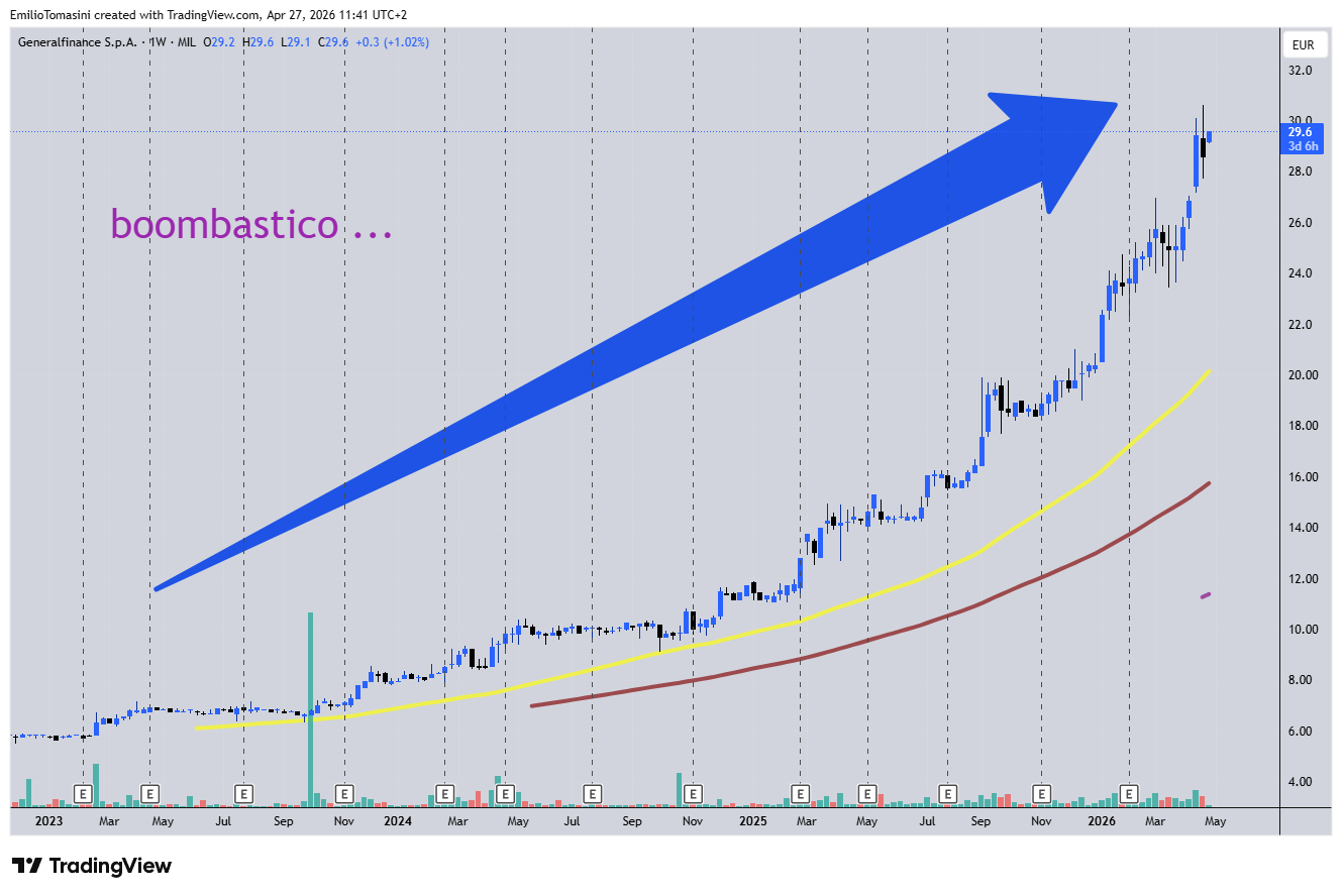 Il dato che avevamo nel nostro indicatore proprietario ITI— GENERALFINANCE, posizione “aperta”, valore operativo 31,3666, performance 7,51%, — va letto in questo contesto: non siamo davanti a un titolo fermo, ma davanti a un’azione che ha già corso molto e che oggi si trova nella parte alta del proprio range annuale. Tradotto: il mercato ha iniziato a pagare Generalfinance non più come una piccola promessa, ma come una società che deve continuare a consegnare numeri.
