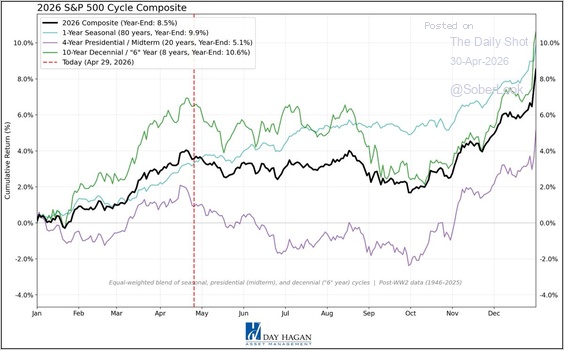 La linea nera rappresenta un indice composto stagionale dell’S&P 500 per il 2026. In pratica mette insieme diversi cicli storici: la stagionalità annuale, il ciclo presidenziale americano e il ciclo decennale.