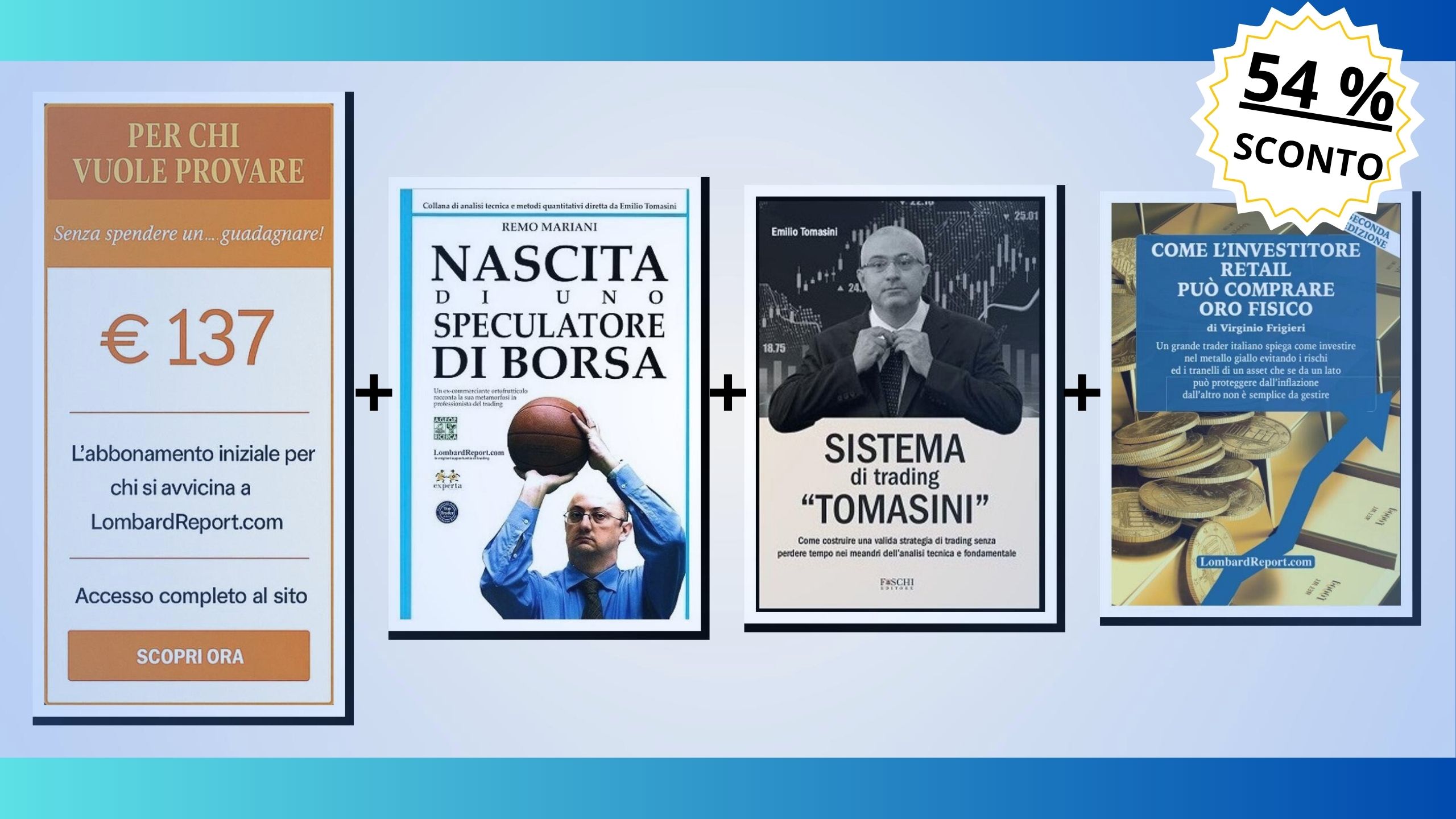 • Abbonamento Mensile a Lombardreport.com con compresi tutti gli editoriali dei nostri trader, accesso ai portafogli, facilities agli eventi organizzati da noi e molto altro. Un filo diretto tra chi mastica la Borsa come pane quotidiano e chi ha voglia di investire seriamente.