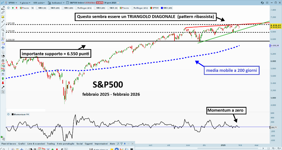 A me ricorda un ciclista che dopo una lunga salita ha il fiatone e non riesce a fare più ulteriori salite. Il pattern che si vede tra i due segmenti rosso e verde sembra essere un triangolo diagonale che ha un target grafico teorico sul supporto chiave a 6.550 punti. Se l’indice dovesse scendere fino su quel sostegno entrerebbe in un trend di medio periodo di tipo laterale puro. Invece esso farà ulteriori salite in caso di superamento dei 7.000 punti.